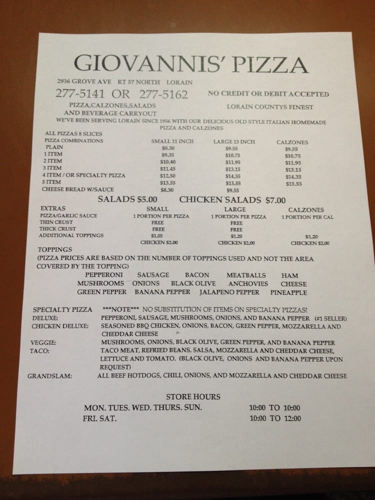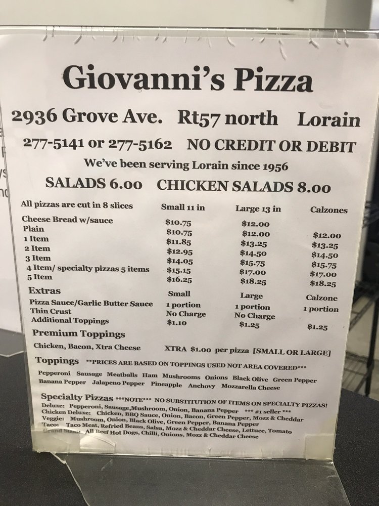 Introducing the menu at Giovanni’s Pizza, located in Lorain, OH, is a delightful experience with a unique twist on traditional pizzas. Customers rave about the thin, crispy crust, perfect blend of tomatoes and mozzarella, and a sprinkle of basil that transports them straight to Napoli. The generous toppings, gooey and cheesy consistency, and perfectly crispy crust make Giovanni’s Pizza a must-try for any pizza aficionado. Despite being a small establishment offering only carry-out, the quality, consistency, and perfection of their pies have not faded over the almost 70 years in business. Whether you are a local or driving from out of town, Giovanni’s Pizza is worth the trip for a taste of some of the best pizza around.